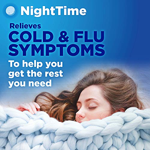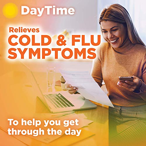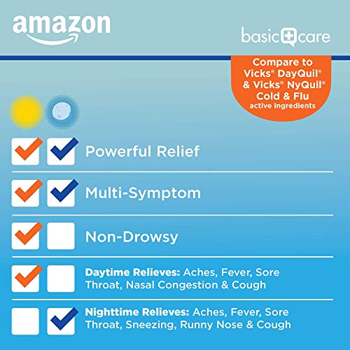 Compare to Vicks DayQuil Cold and Flu and Vicks NyQuil Cold and Flu active ingredients. When cold and flu season hits, you need to be prepared with maximum strength relief, day or night. Amazon Basic Care Daytime and Nighttime Cold and Flu Relief is a powerful combination pack to help tackle tough cold and flu-like symptoms. Daytime in original flavor is non-drowsy, and it relieves aches, fever, sore throat, nasal congestion and cough. Daytime contains a pain reliever, fever reducer, cough suppressant and nasal decongestant. Nighttime in cherry flavor relieves cold and flu-like symptoms such as aches, fever, sore throat, sneezing, runny nose and cough so you can rest. Nighttime contains a pain reliever, fever reducer, cough suppressant and antihistamine. The products in this day and night twin pack are gluten free. Daytime cold medicine is alcohol and antihistamine free. Nighttime contains 10 percent alcohol. Nighttime is for adults and children 12 years and over. Daytime is for adults and children 6 years and over.