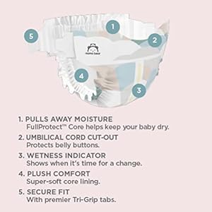Stretch fasteners and elastic waistband with premier Tri-Grip tabs for a secure hold around your baby; Umbilical cord cutout to protect baby’s belly button; Each pack contains two diaper designs, White and Cloud Dreams
