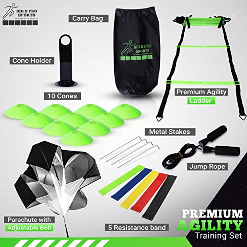 Complete Package for Coaches, Youth & Pro Athletes: Create tough agility courses with our speed ladder and drill cones. Boost endurance & explosiveness with our quality jump rope & running parachute, and increase strength with 5 resistance bands.