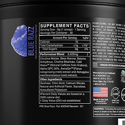 An American Company –Blackmarket’s in house labs delivers on rigorous quality and safety tests. Expect the best in a pre-workout formulated, blended, and packaged in the USA.