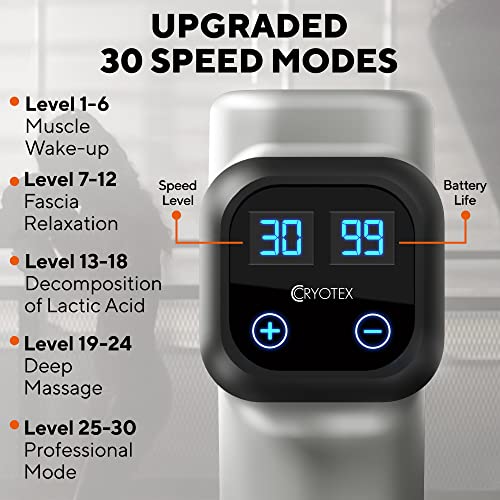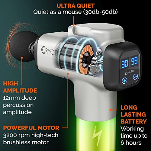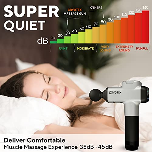 POWERFUL & VERY QUIET – Enjoy your deep tissue massage gun and repair your muscles in a relaxing silence. Cryotex Massage Gun is developed with low noise motor. With 45 db noise reduction technology and a high-torque motor, professional deep tissue massager has 30 adjustable speed settings delivering up to 3,200 percussions per minute.