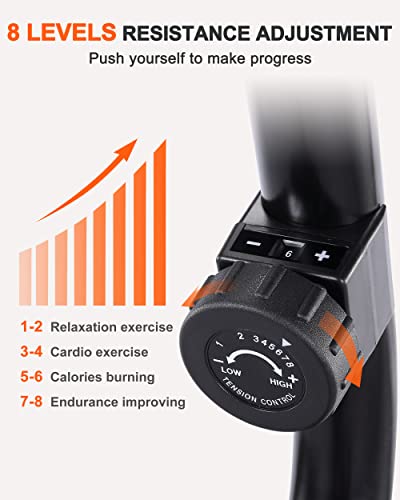 [8 Levels Magnetic Resistance] 8 levels of tension control give you enough and more uniform resistance to meet different intensity needs. The cooperation of magnetic flywheel and belt drive system offers a whisper-quiet riding experience.