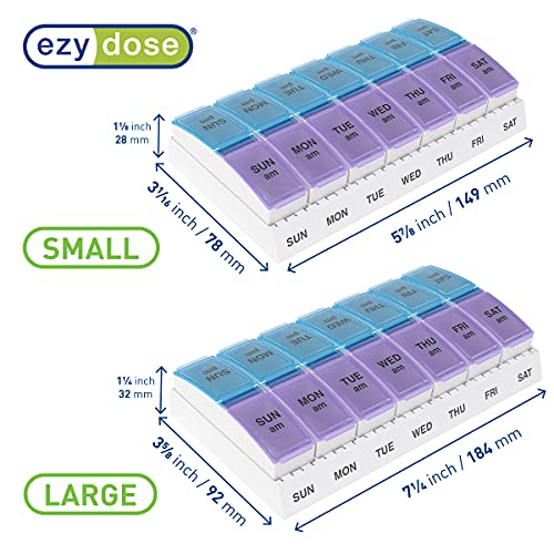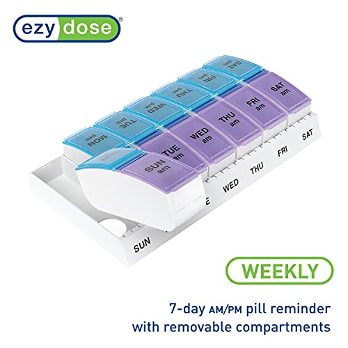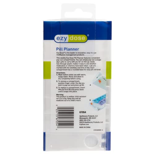 Ezy Dose Weekly Pill Planner – 7-Day AM/PM Pill Planner – This AM/PM Weekly Pill Organizer is Perfect for Scheduling Your Week’s Medication. Its Push Buttons and Transparent Lid are Simple To Use and Help You Keep Track Of Your Medication Through The Week . This 7-Day Pill Planner is designed for easy use. Its buttons and rounded bottom make it easy to open and retrieve medications. Separate AM/PM compartments make it easy to organize pills taken twice a day. The product’s clear lid allows easy visibility of medication to help prevent missing doses.. The main features of the 7-Day AM/PM Pill Planner include:.Easy Use – Push Buttons and Rounded Bottoms make the planner easy to open and medication easy to retrieveDay And Night Reminders – Easily plan your twice a day medication doses Clear Lid – Allows easy visibility of medications to help prevent any missed doses Large Compartments – Each compartment can fit 30 aspirin tablets and has plenty of room for all of your daily medications. 8 3/4 x 4 1/2 x 1 Inches Product recommended by The Arthritis Foundation and is great for anyone with dexterity problems! About Ezy Dose:Ezy Dose is the leader in easy-to-use medication management products. Many of our push-button pill planners are endorsed by the Arthritis Foundation for our ease-of-use design. Ezy Dose products make living healthier simply easier with products like pill cutters, pill crushers and a full line of easy-fill planners..
