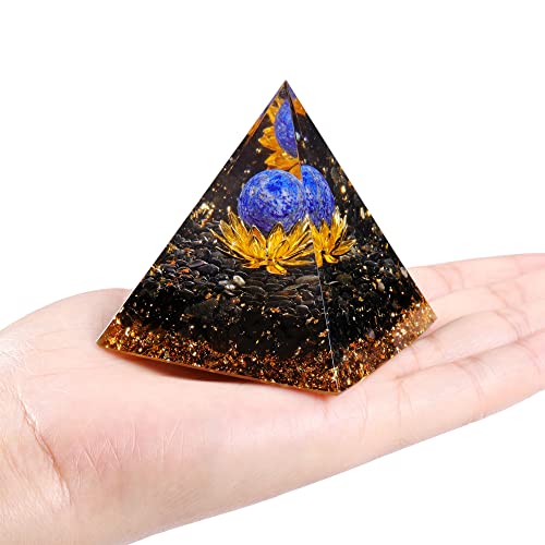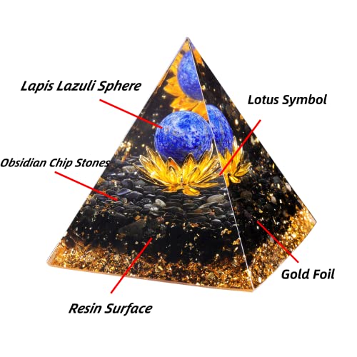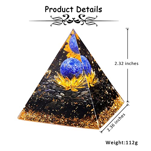 [Crystal Sphere Orgonite Pyramid] The orgonite pyramid is exquisite handcrafte with Copper Lotus symbol. It’s made of Lapis Lazuli crystal sphere, Obsidian chip stones, mixed gold foil at the bottom. The surface used of resin. Size about 2.36″ x 2.32″(6cm x 5.9cm). Weigh about 100g(3.5 oz). Please note: This is natural materials and handmade item, the size and color may be slightly differs from image shows.