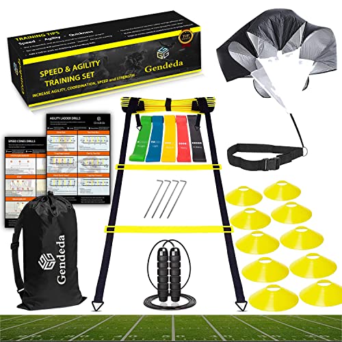 GREAT VALUE KIT: Our bundle includes a 20ft. agility ladder with 4 hooks and 10 speed cones, a resistance parachute, a jump rope,a Gym Carry Bag, and 5 loop resistance bands – a complete set for your fitness workout.