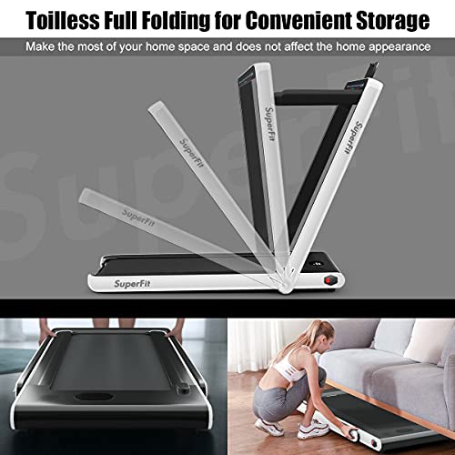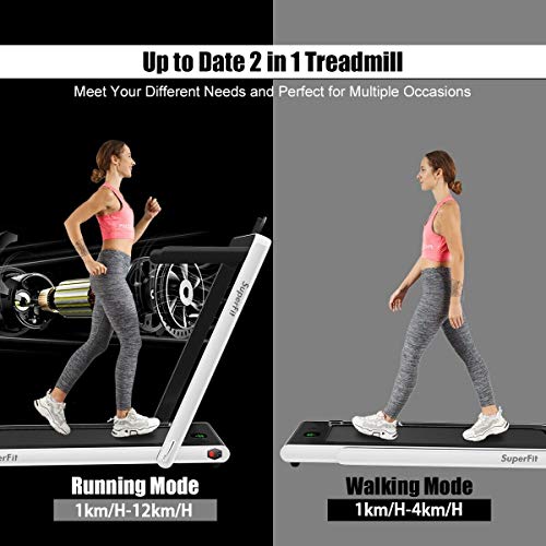 INNOVATIVE 2-IN-1 FOLDING TREADMILL– Compared to ordinary treadmills, our 2-in-1 Superfit treadmill has 2 modes to meet your different sports needs. When the riser is folded, it can be used as a jogging machine at a speed of 1-4km/h, when the handrail is raised, the running speed is 1-12km/h, and the speed unit could be switched between mile and km in APP.