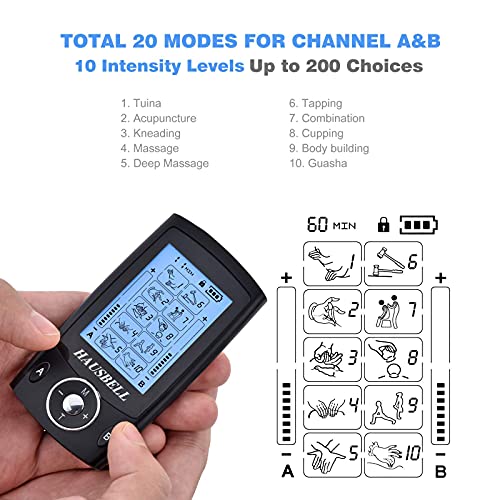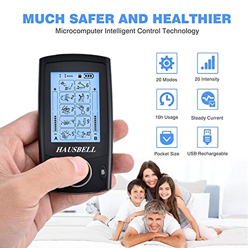 【TENS Unit Professional 20 levels】HAUSBELL TENS muscle stimulator combines traditional acupuncture therapy with current stimulation, using different waveforms current to stimulate sensory nerves and muscles, activating specific natural pain-relieving mechanism, allowing you to experience the real feeling of acupuncture, back kneading, massage, cupping, deep massage, non-invasive relief of arthritis, back pain, knee pain, leg pain, neck pain, shoulder tension and sports injuries.