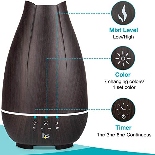 DIFFUSER FOR ESSENTIAL OILS features a smart touch panel to easily control the lighting, high or low mist mode and a 1hr/3hr/6hr timer that will keep misting until the water runs out.
