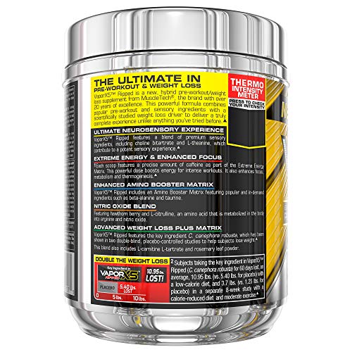 PRE WORKOUT plus WEIGHT LOSS – Vapor X5 Ripped is a new, hybrid pre-workout / weight loss supplement. This formula combines popular pre workout and sensory ingredients with a scientifically studied weight loss driver to deliver a truly complete experience