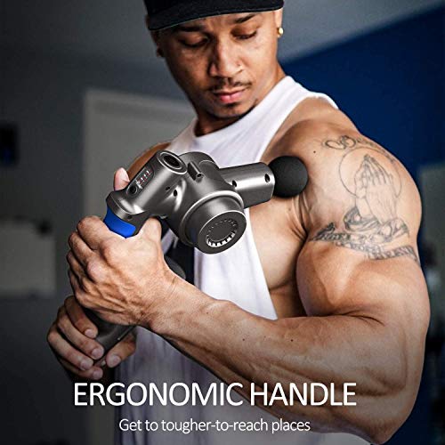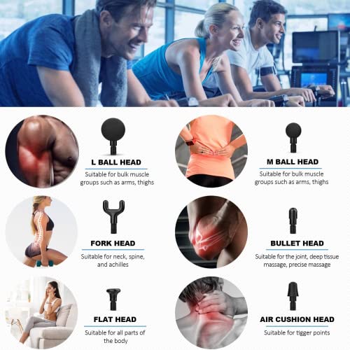 5 angles adjustable massage head: Adjustable angles massage heads to reach hard-to-reach body spots without arm fatigue and wrist strain; you can easily massage effortlessly your upper and mid-back by rotating the massage head to different angles or holding the gun in different directions.