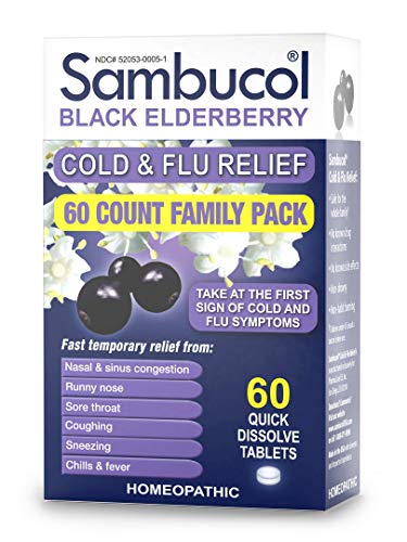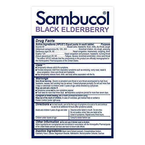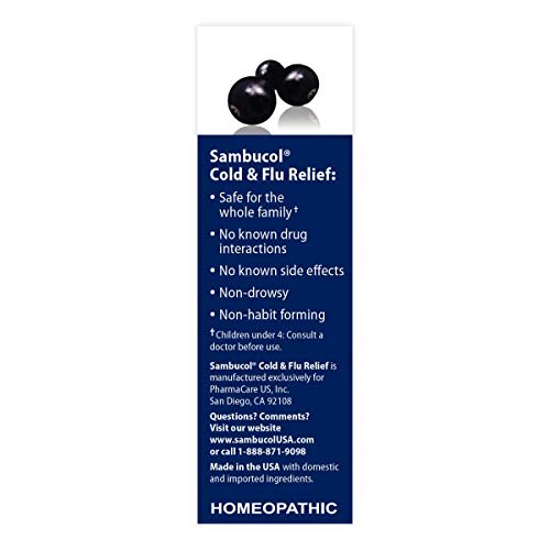 Sambucol Black Elderberry cold & Flu Relief provides fast, temporary, homeopathic Relief from cold & Flu symptoms like nasal and sinus congestion, runny nose, sore throat, coughing, sneezing, chills & Fever; take at the First Sign of cold and flu symptoms