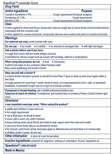 The Power of VICKS brought to you by the world’s #1 selling cough and cold brand! Vicks VapoRub medicated vapors begin to work fast to relieve your cough. For adults and children 2 years and over, use on chest and throat to temporarily relieve cough due to the common cold. Also great for use as a topical analgesic to relieve minor aches and pains in your muscles and joints. Enjoy the calm, soothing lavender scent with lavender essential oil. For cough suppression: rub a thick layer on throat and chest. Cover with a warm, dry cloth if desired. Keep clothing loose about throat and chest to help vapors reach the nose and mouth. Use up to three times daily or as directed by doctor. For muscle/joint minor aches and pains, apply to affected area not more than 3 to 4 times daily.